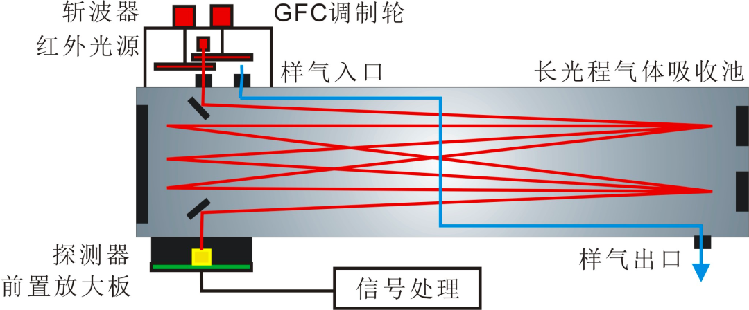 光源发出的红外光经GFC调制轮交替进入气体池,一路被充满待测气体的气泡所吸收,一路穿过完全不含待测气体的气泡,两路光分别经透镜汇聚后由红外探测器接收,经过信号处理得到测量信号和参考信号。通过对两路信号进行分析,可以得出气体中相关组分的浓度。